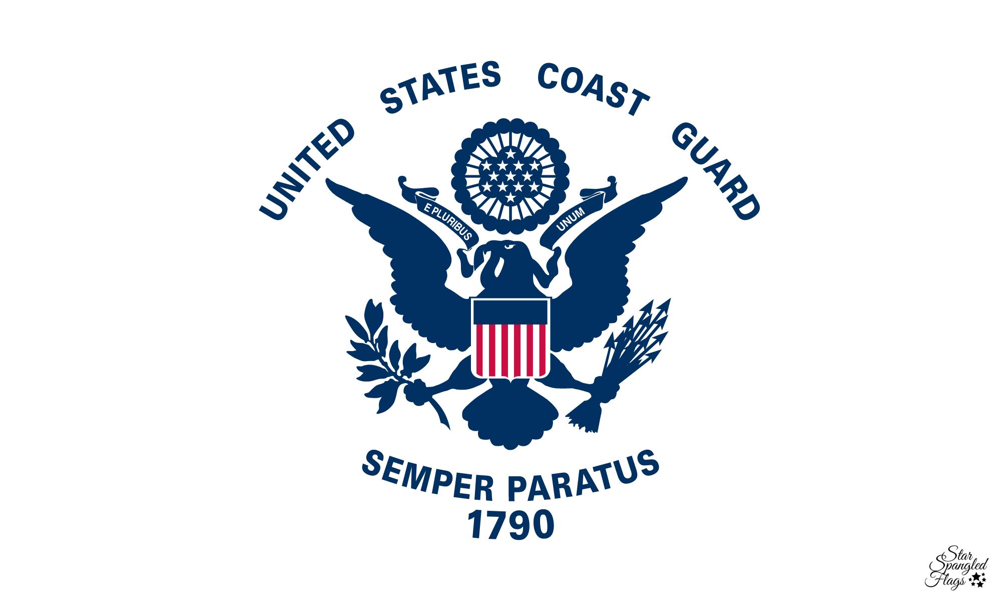 The symbol on the United States Coast Guard Flag is the great Seal of the United States in blue centered on a white field. Above the Seal, in an arc are the words, “United States Coast Guard”, and below the Seal are the words “Semper Paratus” meaning: “Always Ready,” and beneath that is the year 1790, the year the Coast Guard was established.