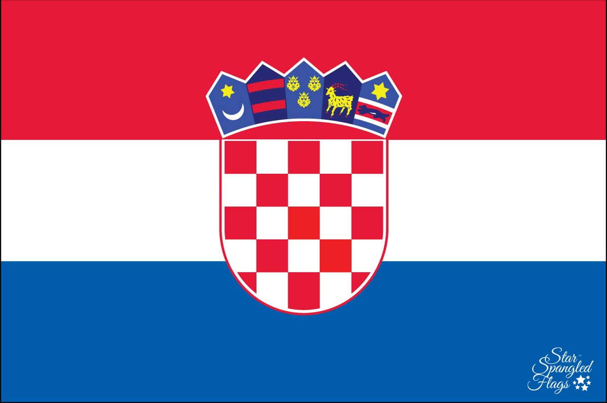 The Republic of Croatia’s coat of arms con a checkerboard shield, containing exactly 13 red and 12 silver squares. It is these red and silver(white) checks(squares) that define the flag and inspire so much passion (both positive and negative) throughout the region. Above the shield lies five smaller shields symbolizing historical regions within Croatia. These regions from left to right are Croatia, Dubrovnik, Dalmatia, Istria, and Slavonia.