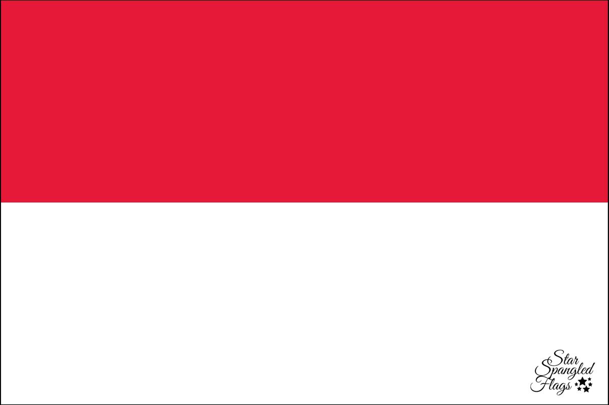 The flag of Indonesia is a simple bicolor of two equally-sized horizontal bands of Red (top) and white. The flag is almost identical to that of Monaco except for the ratio of its dimensions of the red and white.