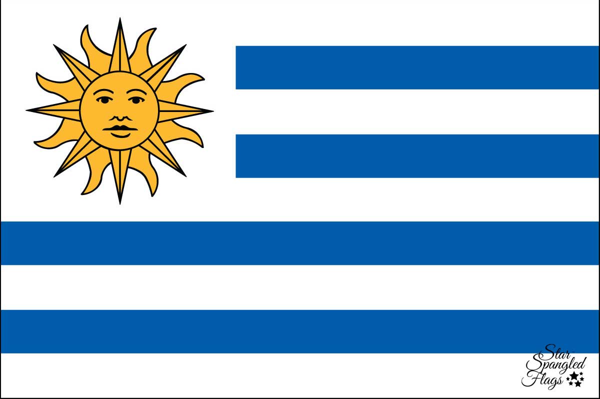 The flag of Uruguay was first adopted by law on December 16, 1828 and had 19 stripes. Then on July 11, 1830, when it was last officially adopted, a new law reduced the number of stripes to nine. The flag was designed by Joaquin Suarez, the first head of state of Uruguay, in 1828. He later was President of Uruguay from 1843 until 1852. Uruguay is located in the southern part of South America and shares borders with Brazil to the north, and Argentina to the west.