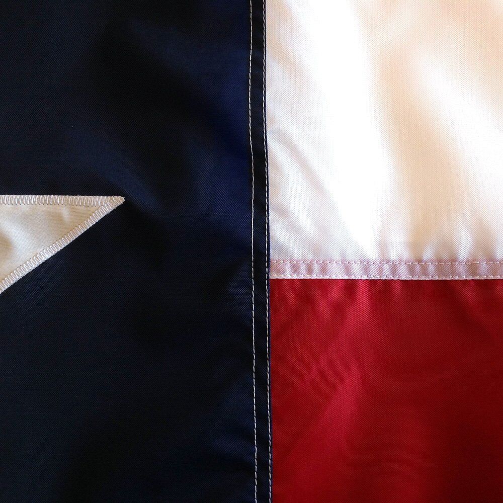 Our nylon state flags of Texas are crafted using 200 denier nylon material. It is constructed with lock stitching, therefore increasing flag life. Our nylon material is extremely durable and looks beautiful in the frequent sun of Texas. We also use reinforced hem stitching on the top and bottom of the fly end, and 4 rows of stitching on the entire fly end.